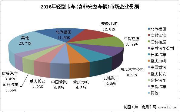 據(jù)中國汽車工業(yè)協(xié)會統(tǒng)計,2016年國內(nèi)輕型卡車(含非完整車輛)累計銷售1539820輛,同比累計下降1.20%。累計銷量前十企業(yè)共銷售1173797輛,占據(jù)整個輕型卡車(含非完整車輛)市場總銷量76.23%的份額。從增幅看,銷量前十企業(yè)6增4降,累計增幅最高的是中國重汽,達到35.59%,安徽江淮和重慶長安兩家企業(yè)的增幅也超過10%;降幅最大的是金杯汽車,達到59.08%。