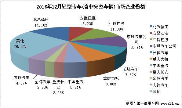 2016年12月份,國內(nèi)輕型卡車(含非完整車輛)銷售161633輛,同比增長11.53%。銷量前十企業(yè)7家增長3家下滑。具體排名如下: